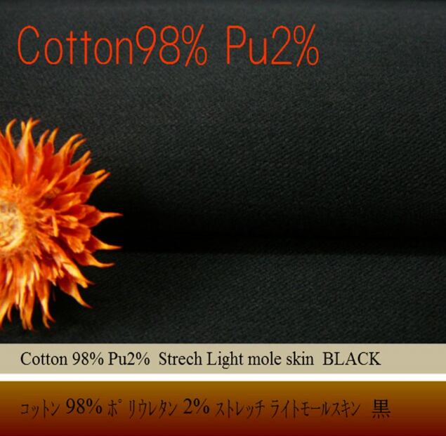 ストレッチ性に優れた軽めのモールスキン、幅120cmの生地です。黒の1色のみのご提供となりますが、その分お手頃価格でのご案内です。起毛とシャーリングを繰り返し、密に微起毛された表面はなめらかで肌触りが良く、ソフトで暖かな風合いは、ジャケットやパンツなどの秋冬アウターだけでなく、クッションカバーなどにも最適です。さらにストレッチ性があるため、子供服の製作にもおすすめ!あなたのアイデアを形にするために、ぜひご利用ください。